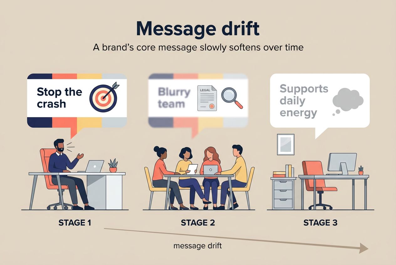 New people join the team. Legal gets involved. Someone says, "we can't claim that." Someone else says, "we should sound more premium." Another person says, "what if we broadened it a little so we could reach more people?"
