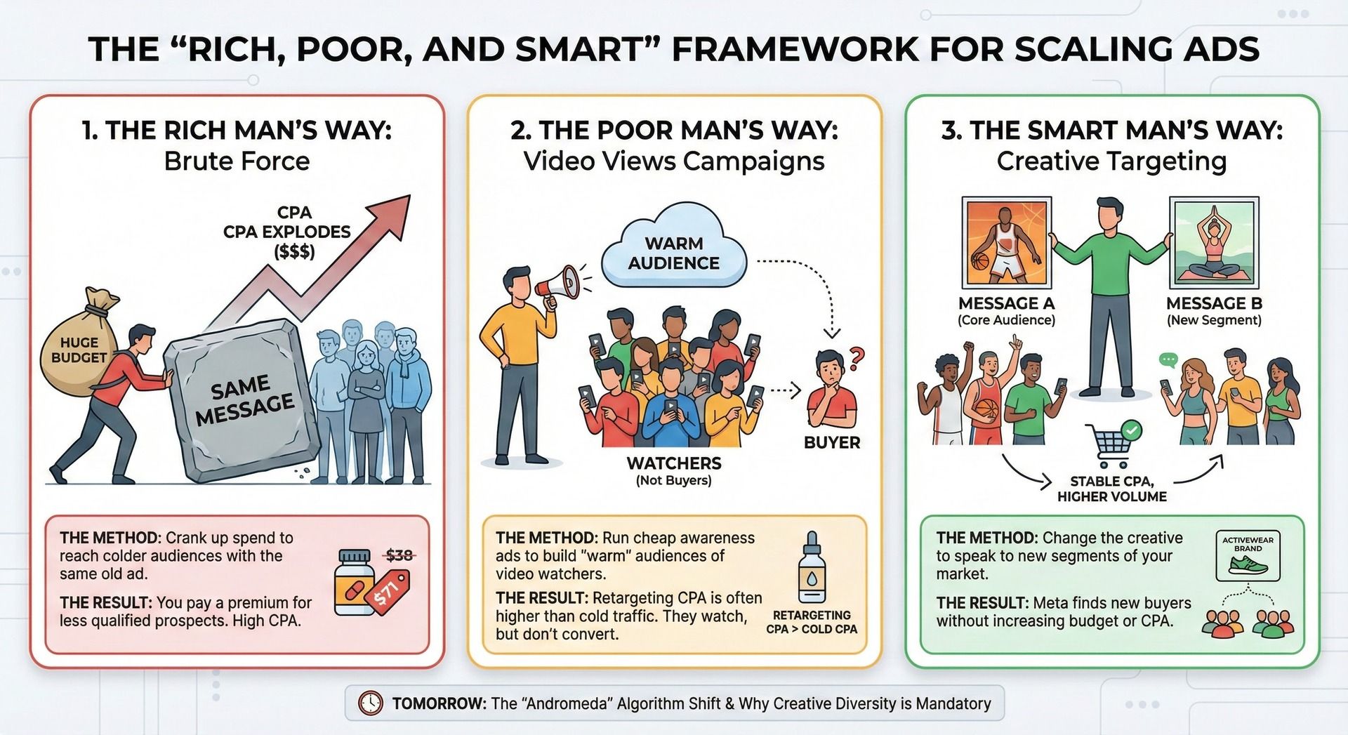 The lesson: You don't scale by spending more or running cheaper campaigns. You scale by speaking to new segments of your market.
