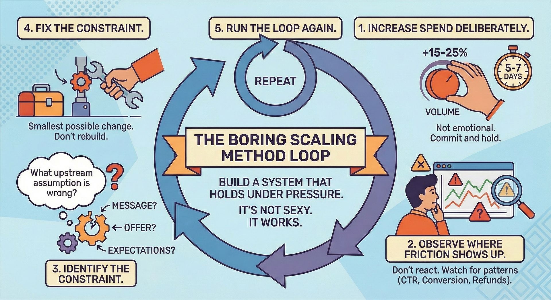 Increase spend. Observe. Identify. Fix. Repeat.