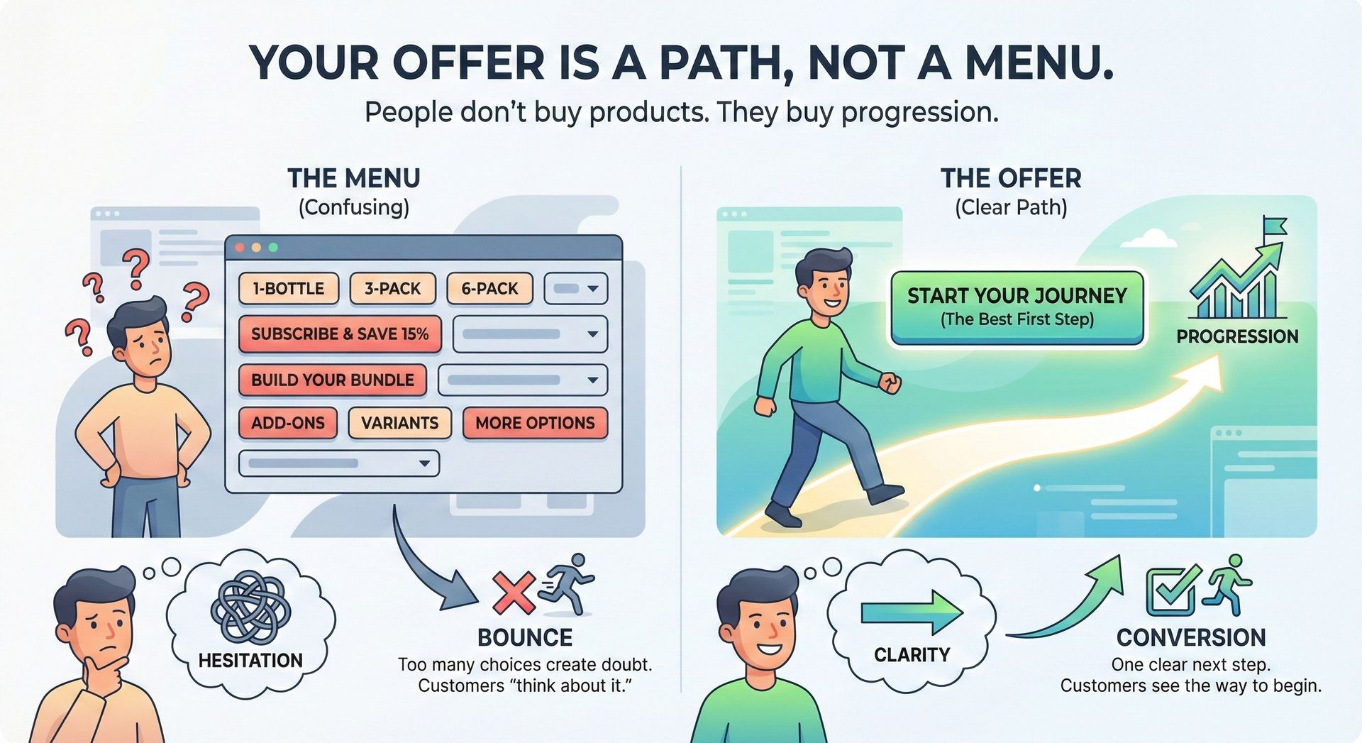 P.S. Go look at your main landing page right now. Count how many choices a new customer has to make before they can check out. If it's more than two, you probably have a menu problem.